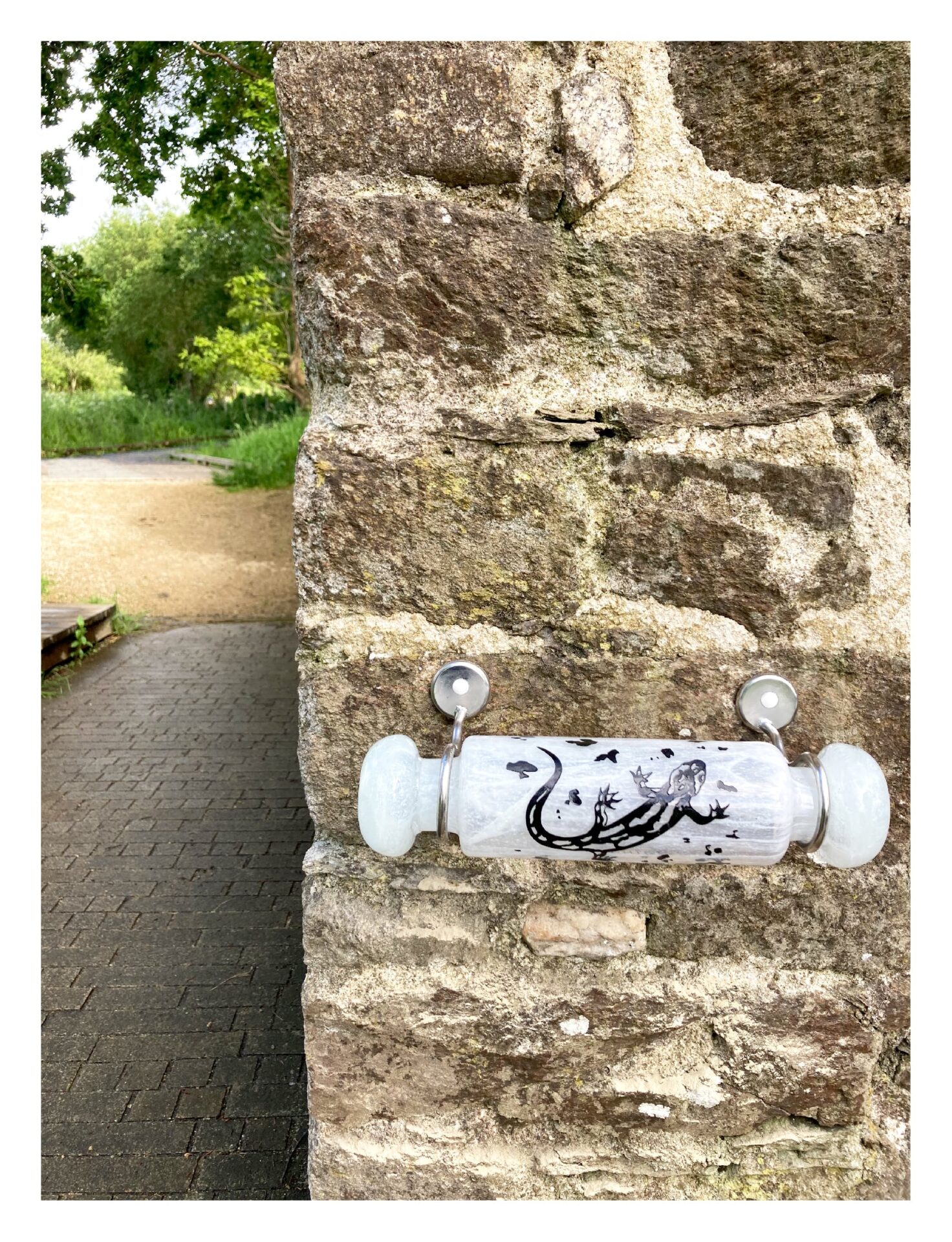 S.D : “L’implantation de la signalétique pédagogique a été divisée en trois phases. Des objets ont été installés. Il s’agit de pièces en verre qui ont été gravées d’un texte et d’une image relatant la faune et la flore du site. Ce sont des objets très résistants et qui, en même temps, amènent quelque chose d’assez précieux comme les petites perles qu’on a implantées sur le parcours. Ce qu’il y a d’intéressant avec ces pièces de verres, c’est qu’elles sont légèrement phosphorescentes la nuit, ce qui permet d’avoir des repères dans les prairies. Cette signalétique pédagogique en verre s’adresse principalement aux enfants. Je me suis toujours dit que si on mettait en valeur un site comme la fontaine Margot, c’était pour leur montrer qu’il y a une vie, des insectes, des animaux, des amphibiens, des batraciens, et surtout, qu’il faut en être conscient et ne pas en avoir peur.